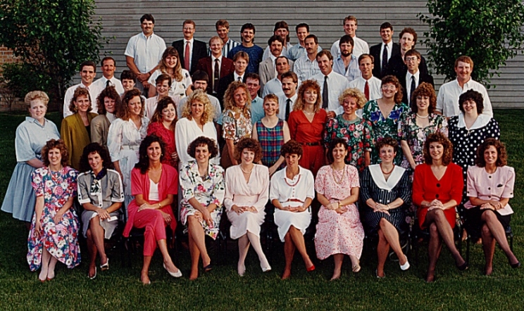 | FIRST ROW: Kathy Barta, Lynne McPhillips, Kara King, Mary Beth Feller, Darla Unruh, Denise Dau, Pam Goodhard, Charlene Sachs, Lori Andersen, Lisa Drake. SECOND ROW: Sherie Ueckert, Beth Jacobsen, Becky Christensen, Debbie Davison, Kris Pennington, Lisa Gerken, Shelly Christensen, Theresa Witt, Cathy Waschek, Kara Elenga, Kerri Ponec, Christine Korth, Phyllis Hillebran. THIRD ROW: Jon Wollen, Julie Gubbins, Susanne Schmidt, John Barker, Randy Housley, Trent Grace. FOURTH ROW: Jamie Carda, Robyn Hilbers, Eric Reither, Gary Prideaux, Jeff Culbertson, Mark Pilkington, Bryan Thompson, Calvin Paasch. FIFTH ROW: Dennis Shavlik, Alan Rohwer, Roy Nichols, Kurt Oswalt, Rex Roth. SIXTH ROW: Scott Bruhn, D.C. Mangimelli, Mark Peterson, Dave Polk, Alan Kahnk, John Carda, Tom Eurek, Ed Miller. |